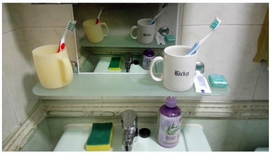 The first step in the process is sorting. Sorting is about categorising items in the work environment. The oral hygiene practice stations (work environment) of elderly with AD are usually untidy (Figure 1). To help elderly with AD to perform oral hygiene practices, the first step is to sort out what is needed. The work areas, cabinets, and drawers should be cleaned, organised, and labelled according to their contents. This allows elderly with AD to identify the necessary items to do the work and to get rid of what is not needed. A photograph before sorting should be taken as a record (Figure 1). In the sample photograph, irrelevant items (hand wash, facewash, shaver, and comb) together with necessary items (toothbrushes, toothpaste, and rinsing cups) occupy the station for performing oral hygiene practices. During sorting, the necessary items or bathroom equipment for oral hygiene (e.g., toothbrush and rinsing cup) should be selected, and unneeded or useless equipment will be classified as unnecessary items and should be removed from the oral hygiene practice station.