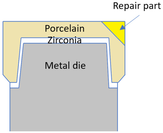 To standardize the experimental methods and conditions, multiple factors must be defined and controlled. The metal dies used in this study were industrially manufactured with dimensions according to the clinical guideline. The zirconia copings and the repair parts were standardized with respect to the design, shape, size, and thickness. Beveling procedures to simulate porcelain chipping were accomplished using an Isomet 2000 Precision saw (Buehler) with a custom jig to ensure accuracy. Beveling at 45 degrees was used, as this caused the highest shear stress to the specimens during vertical loading.