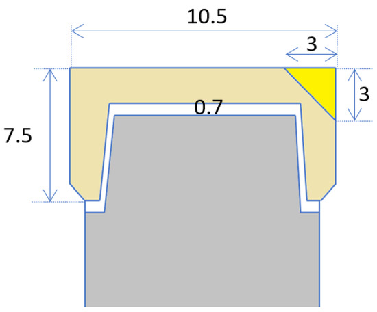 Cross sectional view of specimens with standard dimensions in millimeters. Cutting plane containing the plane of symmetry of the repaired part and the cylinder axis.