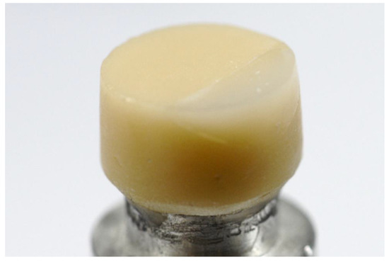 Cemented crowns were put in a customized stub. This stub allowed the crowns to be placed at 45 degrees to the wafering blade of the Isomet 2000 Precision saw (Buehler, USA). A bevel-cut on the porcelain veneer (45 degree, 3 mm width) was made on one side of each crown with 15LC diamond-wafering blade mounted on an Isomet 2000 Precision Saw. The cuts were made at 800 rpm with 300 g of load with cooling provided by a dual-nozzle water irrigation system. Figure 3 shows the crown after beveling.