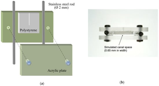 A 7-day Enterococcus faecalis biofilm was cultivated on a polystyrene sheet before assembling the (pre-sterilized) canal model aseptically. Briefly, E. faecalis (strain ATCC 29212) was first inoculated on blood agar plate and cultured anaerobically for 24 h. One scoop of the bacteria was taken from a colony and transferred into sterile brain heart infusion (BHI) broth to make a suspension. The suspension was titrated to 1 × 107 colony forming units (CFU)/mL (McFarland standard 4) by monitoring the optical density at 660 nm with a microtiter plate spectrophotometer (SpectraMAX 340 Tunable Microplate Reader; Molecular Devices, Sunnyvale, CA, USA). Aseptic technique was strictly followed. The acrylic plate carrying the polystyrene sheet was then placed in a culturing bottle with the polystyrene surface facing upward and exposing to the culture solution for bacterial colonization. The prepared E. faecalis suspension was added into the bottle until the entire specimen was covered. The bottle was put in an incubator-shaker (Orbital Incubator SI 500; Stuart, Staffordshire, UK) at 37 °C and 80 rpm for 1.5 h for bacterial adhesion. After that, the suspension/solution was drawn away completely from the bottom of the bottle by a pipettor without touching the biofilm surface. Then, 7 mL of sterile BHI medium was added, the bottle sealed with a lid and plastic cling-film (Parafilm “M”; Pechiney, Chicago, IL, USA), and incubated in the incubator-shaker at the same settings for a total of 7 days. The BHI medium was replaced daily during this period. After 7 days, the polystyrene plate was washed gently by waving it in 7 mL of PBS; the components of the canal model were fastened together with sterile stainless steel screws and nuts. The assembly left a space of (2.0 – 1.35 =) 0.65 mm width, between the acrylic plate on one side and the polystyrene sheet (with biofilm) on the other, to simulate an oblong root canal space, akin to a wide isthmus (Figure 1B). The bottom and the two edges of the box-shaped model were sealed with autoclave tape (3M, St. Paul, MN, USA) to prevent the irrigant from leaking out. The canal model was secured in a metal vice on an adjustable platform with the polystyrene sheet oriented vertically, guided by a plumb-line set. Sterile physiologic saline (Thai Otsuka Pharmaceutical, Samutsakorn, Thailand) was used as the irrigant in the experiment, to eliminate any confounding due to antimicrobial action of the solution. The saline was gently injected to fill up the space (Figure 2).