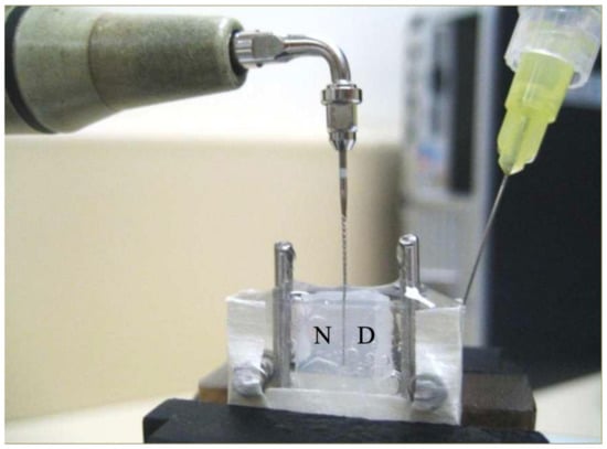 Experimental setup, with “N”= near-side to the ultrasonic handpiece, and “D”= distant side. Sterile saline solution was slowly injected into the simulated canal space to replenish any solution that was splashed out by the vibrating file.
