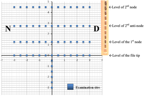 Schematic representation of the 58 examination sites, with the file aligned on the Y-axis and its tip situated at the origin. (Note: A photo of the vibrating endosonic file was inserted to illustrate the locations of the nodes and anti-nodes.)