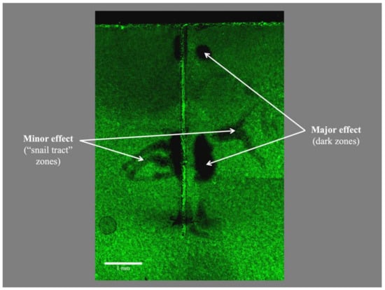 Typical appearance of the biofilm remaining on the polystyrene strip of the artificial canal model after passive ultrasonic irrigation, with viable bacteria stained and fluorescing in green. Notice (i) the absence of dead bacteria (that should have been stained in red), as sterile saline was used as the irrigant; (ii) non-uniform dislodgement of viable bacteria by the vibrating ultrasonic file which was held close to, but not in contact with that surface; and (iii) areas with dislodged bacteria were situated at a level approximating to the location of the anti-nodes of the vibrating file.