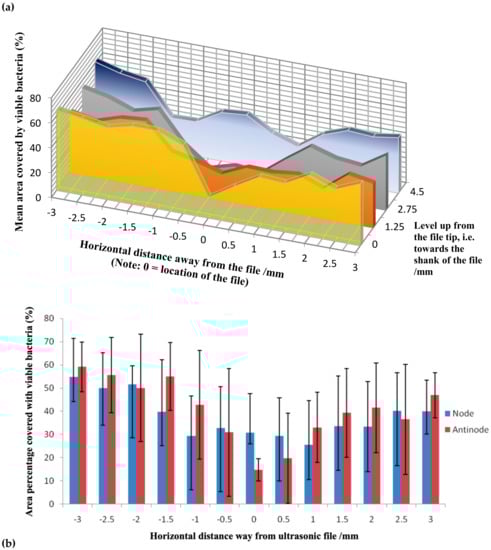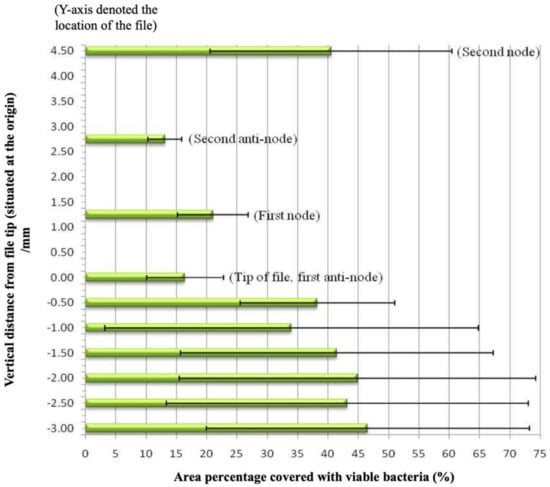 The greatest declumping or mechanical cleaning effect (13.1%) was observed at the 2.75 mm level that corresponded to the location of the second anti-node, instead of the file tip (16.4%) where the largest displacement amplitude is anticipated [25,26]. Our observation corroborated the findings of Felver et al. [29] who demonstrated by sonochemiluminescence that the tip of an ultrasonic scaler, despite showing the greatest vibration amplitude, does not exhibit spatially widespread effects. Taken together, those areas on the reference line (closest to the endosonic file) opposing the anti-nodes were significantly cleaner than at the nodes (Figure 5b). There was little difference elsewhere, regardless of their locations, although generally the farther (horizontal distance) away from the vibrating file, the lesser the cleaning effect could be found. This is expected, because the ultrasonic energy will dissipate while transmitting through the medium. The mechanical cleaning effect also dropped towards (i.e., moving up) the shank of the instrument, away from the file tip, after the second anti-node.