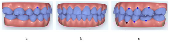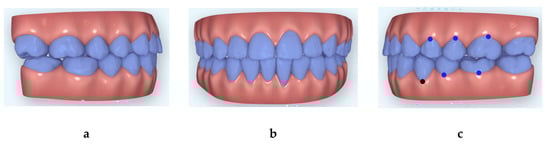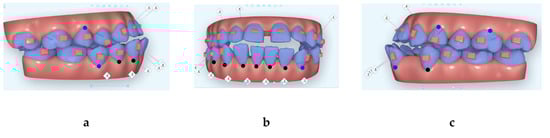 Images of the beginning of final Clincheck (a): right side; (b) frontal view and (c) left side.