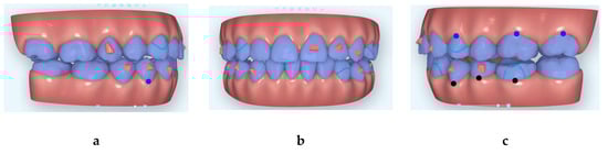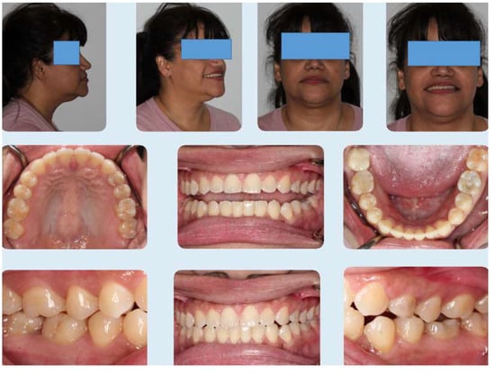 This forty-five year old female presented with chief concerns that she wanted to close her anterior open bite and close spaces between anterior teeth as well as move her protruded front teeth lingually and correct her under bite. Initial clinical records (Figure 1 and Figure 2) show concave profile with prominent chin projection and competent lips. She reported that she breaths through her nose but she had an anterior tongue thrusting habit. Intraoral examination revealed that the patient had an extra (third) premolar in the lower left quadrant of her mouth. Right molars and canine relationships revealed half cusp Class III occlusion and left side molars and canine relationships were Class I occlusion (Figure 1 and Figure 2b). The patient also presented with anterior and lateral cross bites that were extended from upper right to upper left first premolars with a 3-mm open bite. In addition, the patient had upper 5-mm and lower 12-mm spacing (considering the spaces of the lower left extra (third) premolar). Bolton analysis revealed total mandibular excess of 0.72 mm (total ratio 92.02%) and mandibular anterior excess of 1.04 mm (anterior ratio of 79.39%). Upper dental midline was centered to the patient’s facial midline and lower dental midline was deviated to the left by 2 mm from the upper dental midline. The patient gave her informed consent for inclusion before they participated in the study. The study was conducted in accordance with the Declaration of Helsinki, and the protocol was approved by the Ethics Committee of the University of Alberta (Project identification code: Pro00074117, date of approval: 13 December 2017).
