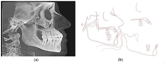 (a) Final CBCT-driven cephalometric radiograph and (b) cephalometric superimposition of before (black) and after (red) treatment cephalometric tracings showing improvement in the patient’s initial chief complaints including open bite and spacing as well as crossbite.
