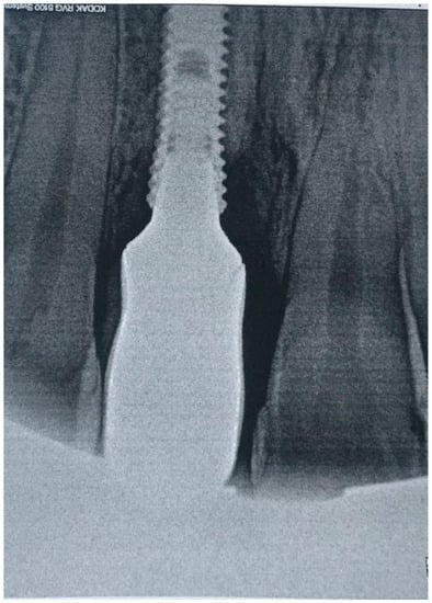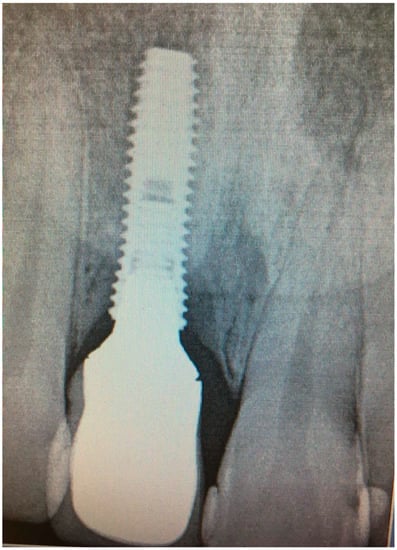 Clinical examination revealed that the patient was rehabilitated through one crown with gum mask cemented on one dental implant placed in 1.1 position and had the presence of local inflammation (with evident redness and swelling) with significant soft tissue retraction. By the use of one plastic probe (Hawe Perio-Probe™, Kerr Corporation, Orange, CA, USA), we found deep (more than 4 mm) probing depth in all sites of 1.1 position of dental implant improving on radiological investigation, with intensive bleeding on probing and suppuration (Figure 6).