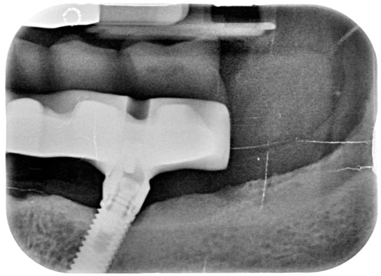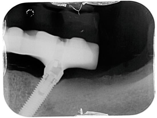Respecting patient’s will, and after a thorough discussion of pros and limits of the treatment options, we decided to perform nonsurgical treatment and monitoring patient over time with the special attention to stabilize the condition of soft and bone tissues. After manipulation, we proposed the use of topical applications of 30% lincomycin hydrochloride (Lincomycin®, DalChemPharm, Khabarovsk, Russia) on the first day of treatment after professional oral hygiene maneuvers (due to the stability of dental implant, ultrasonic cleaning of plaques was performed with Airflow powder and handpiece (Airflow Prophylaxis Master, EMS, EMS, Switzerland) in the area of all teeth and dental implant, using the PI EMS headpiece for Piezon with the plastic cover). We performed two treatments with the use of 7% bovine collagen injections (Collost®, BioPHARMAHOLDING, Moscow, Russia) in two visits within 2 weeks. The choice of treatment was based on the good performances demonstrated by collagen on peri-implantitis and on bone healing in experimental research [,]. After local anesthesia with articaine 4% and epinephrine 1:200,000, the antibiotic was placed directly into the pockets near the dental implant with a syringe with cannula 26G followed by injections of 7% bovine collagen inside bone pockets and gum with syringe and cannula 29G. The injection was given gently, until we clearly visualized the gel spilling outside of the pocket after filling it completely (Figure 7).