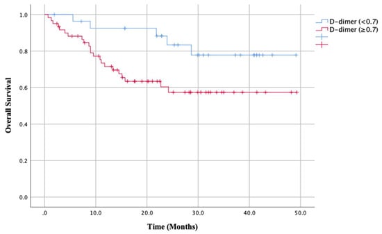 D-dimer is a stable end product of the degradation of cross-linked fibrin, which results from enhanced fibrin formation and fibrinolysis. Recently, it has been reported that increases in D-dimer levels have a correlation between malignant diseases. Moreover, some studies report that D-dimer levels are related to tumor stage, tumor prognosis, and lymph node metastasis, as well as overall survival (OS) in patients with lung cancer, breast cancer, gastric cancer, colon cancer, and gynecological cancer. Elevated D-dimer levels may influence multifactorial interactions between carcinoma growth and the hemostatic fibrinolytic system in malignancy [,,,].