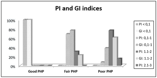 In detail, the difference was statistically significant for the PI and GI values between the subjects who have a good PHP and those who have a fair PHP (p = 0.001), and between the subjects who have a good PHP and a poor PHP (p < 0.001).