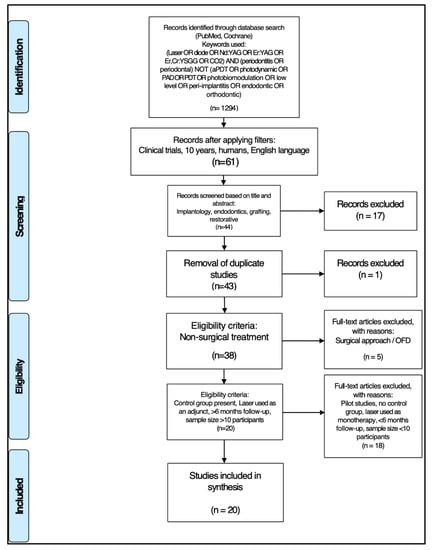 An electronic search was conducted between 15 April and 25 April 2020 relating to laser use as an adjunct in non-surgical periodontal therapy. Databases used were PubMed and the Cochrane Library with the following MeSH terms, keywords and their combinations: