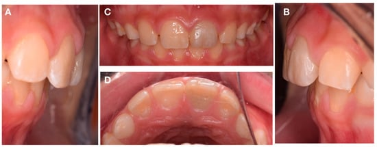Intra-oral photography. Clinical aspect of the lateral (A,B), buccal (C), and palatal (D) view after the 4-year follow-up.