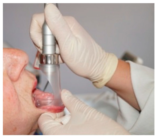 2 as per protocol. The application of the laser was performed with a handpiece, holding the handpiece exactly 4 cm from the mucosa, which was the distance necessary for the collimation of the light beam [