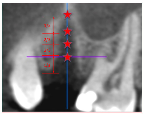 Definition of the measuring points in the cone beam computed tomography scan. The measuring points were located at the junction of coronal third and lower two thirds in the middle and at the junction of apical third and the upper two thirds of the alveoli. Measuring points were arranged on an axis in the center of the alveoli.