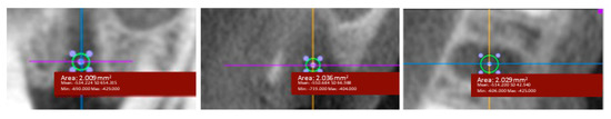 CBCT scans for the evaluation of bone density were loaded into the software OsiriX Lite Version 9.0 (Pixmeo SARL, Bernex, Switzerland). The dentists analyzing the scans were calibrated prior to the evaluation. Each measurement was performed with the same computer at a single workspace. Measurements were performed at three different heights of the extraction sockets. The first measurement was at the junction of the coronal third and the lower two thirds, the second was in the middle, and the third measurement was at the junction of the apical third and the upper two thirds of the alveoli. A fourth measurement of the local bone was further made apical and palatal to the alveoli (Figure 2). For each measurement, a region of interest with an area of 2 mm2 was placed in the center of the alveoli (Figure 3).