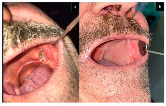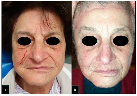 Case 3. A 74 -year old man underwent surgical excision for a recurrent left tuber maxillae squamous cell carcinoma. The patient previously underwent a homolateral neck dissection and radiation therapy, resulting in a depleted vessel neck. For these reasons, a pedicle superficial temporal artery flap (7 × 7 cm) was raised and used to reconstruct the oral defect. The flap donor site was repaired with a skin graft. Five sessions of a 20 mg/mL cross-linked hyaluronic acid (HA) filler (Hyamira Basic, Nyuma pharma®, Arona, Italy) was injected into the grafted area. About 0.2 mL of HA per session was injected over a total of 5 sessions, spaced 30 days apart. After the HA was injected into the graft site, a better skin quality with a more elastic tissue, and a less depressed appearance of the area were noticed. (a) The concave appearance of the grafted site was improved, following several sessions of cross-linked HA injections (b).