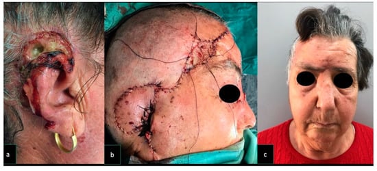 - Algan, S.; Kara, M.; Cinal, H.; Barin, E.Z.; Inaloz, A.; Tan, O. The Temporal Artery Island Flap: A Good Reconstructive Option for Small to Medium-Sized Facial Defects. J. Oral. Maxillofac. Surg. 2018, 76, 894–899. [Google Scholar] [CrossRef] [PubMed]