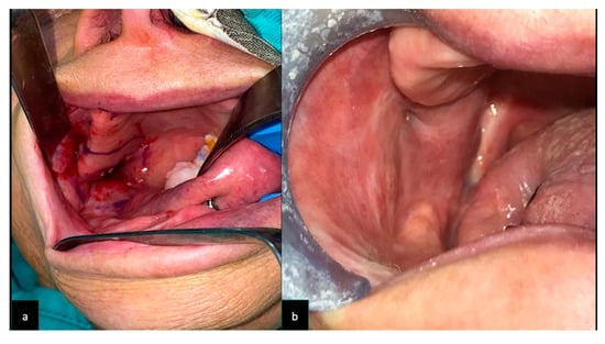 Same patient as Figure 1 (Case 6) (a) Intra-oral aspect of the cancer involving right tuber maxillae and cheek. (b) The reconstruction performed with STAP flap.