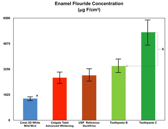 Comparison of enamel fluoride uptake between Crest 3D White Mild Mint, Colgate Total Advanced Whitening, United States Pharmacopoeia (USP) Reference Dentifrice, Toothpaste B, and Toothpaste C. Eighteen replicates (n = 18) of each toothpaste were run and individual mean differences were analyzed by Student–Newman–Keuls analysis. a Brackets represent two standard deviations, mean ± one standard deviation. b Significant difference, p < 0.001.