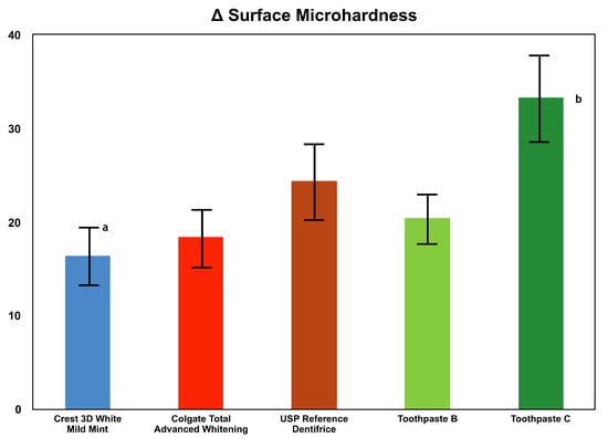 Comparison of Δ surface microhardness after 20 days of remineralization treatment between Crest 3D White Mild Mint, Colgate Total Advanced Whitening, USP Reference Dentifrice, Toothpaste B, and Toothpaste C. a Brackets represent two standard deviations, mean ± one standard deviation. b Significant difference, p < 0.001, large effect size for Toothpaste C over all others with Cohen’s d: 1.64.