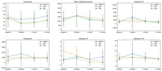 Total protein concentration followed a similar pattern in all the groups, decreasing from the baseline value to the 2-week time-point and then gradually increasing up to 4 months (Figure 2). The concentration of total protein in the PHMG-P group was rising from the baseline level, whereas in the CHX and water groups it remained below the initial titer. Within the CHX group, there was a considerable reduction in the amount of total protein between baseline and 2-week follow-up examinations (p ≤ 0.05), while no significant changes were observed in the PHMG-P and water groups during the study (p > 0.05).