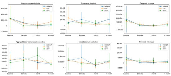 The quantity of Porphyromonas gingivalis, Tannerella forsythia, Treponema denticola, Fusobacterium nucleatum, Aggregatibacter actinomycetemcomitans, and Prevotella intermedia were evaluated by real-time polymerase chain reaction in 59 patients with severe periodontitis, allocated to one of three groups for scaling and root planing with adjunctive irrigants: Aquin (1% polyhexamethyleneguanidine phosphate (PHMG-P)) (n = 19), 0.2% chlorhexidine (CHX) (n = 21), or dH2O (n = 19). The Friedman test was used to reveal differences within treatment groups and the Kruskal–Wallis test served for intergroup comparisons. To estimate the significance of intergroup differences, the Mann–Whitney test was applied to independent groups and the Wilcoxon signed rank test to dependent groups. p-value = 0.05 was defined as statistically significant.