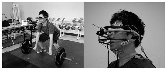 Among the many exercises that exert trunk muscle force [24], the deadlift was adopted in the current study as an exercise with dynamic trunk muscle force exertion for the following reasons. First, the deadlift is a well-known powerlifting performance exercise, in which a barbell is lifted using mainly the back/buttocks/legs, including the latissimus dorsi, trapezius, erector spinae, gluteus maximus, and hamstring muscles, supporting the trunk. Second, as the deadlift is gradually implemented, and the upper body is used to keep the head to the back straight, the trunk posture is maintained, the head shakes less frequently, and jaw movements can be measured. Third, even participants with little experience in deadlifting can learn how to perform it safely and easily. For these reasons, the deadlift was selected as the test exercise.