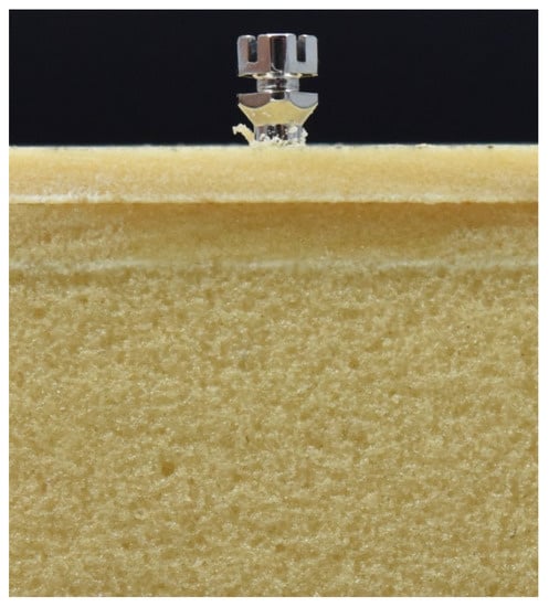 To guarantee homogeneity and perpendicularity of insertion, a specific device was created. It allows axial coincidence among screw and sintetic bone to be obtained [].