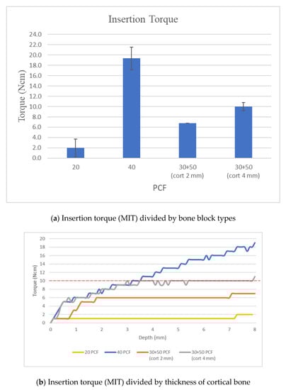 The results showed that the insertion torque values above 10 Ncm were realized only in the 40 PCF sample that represents cortical bone thickness: a rare clinical condition. The mean cortical thickness was recorded by Miyamoto et al. to be 1.49 +/− 0.34 mm for the maxilla and 2.22 +/− 0.47 mm for the mandible [].