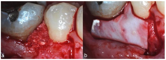 (a) The defect was filled with decellularized bovine bone particles; (b) the defect was covered completely with a bovine pericardium membrane that was trimmed, adapted and placed so as to completely cover the grafted area and the adjacent 2–3 mm of bone tissue.