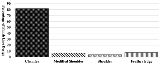 A total of 392 posterior tooth preparations were evaluated in this study. Posterior tooth preparations consisted of 113 premolars, 172 first molars, and 107 second molars. The finish line width ranged between 0.0 and 2.3 mm with a mean of 0.62 mm (±0.2); a comparison of different finish line designs showed that chamfer design accounted for 82% of the finish line designs (Figure 1).