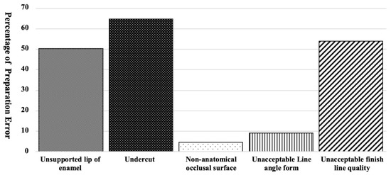 Figure 2 shows the percentage of preparations with an unsupported lip of enamel, undercut at the axial wall, a non-anatomical occlusal surface, and an unacceptable line angle form or finish line quality. Most preparations presented with an unsupported lip of enamel, undercut at the axial wall, or an unacceptable finish line quality. The above-mentioned errors were accounted for 50%, 65%, and 54% of preparations, respectively.