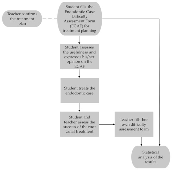 The use of the ECAF is part of the endodontic curriculum for fifth-year dental students at the University of Oulu, Finland. The students participating in the present study were instructed to use the ECAF for treatment planning at the baseline of a RCT. The teacher responsible for endodontics at the educational clinic of City of Oulu (golden standard) who is an endodontist and an experienced clinician, confirmed the treatment plan made by the student. The same teacher filled in a teacher assessment form after the treatment, where she assessed the case difficulty according to the progression of the case and medical records. The research material consisted of case difficulty assessment forms completed by 33 students. The protocol is described in Figure 1.