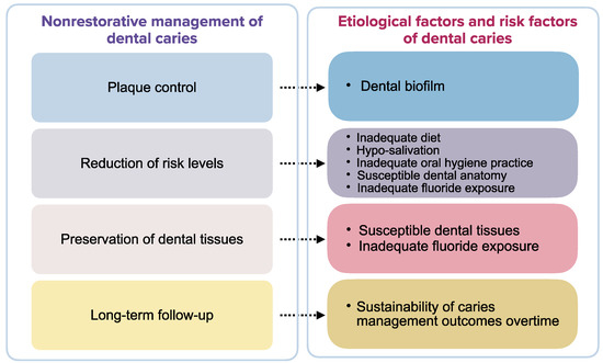 Dental caries is a non-communicable disease [18]. The etiological factors that directly contribute to the progression of dental caries include the biofilm in the dental plaque, diet, susceptible dental hard tissue, and time [19]. The nonrestorative management of dental caries should address the etiological factors and risk factors of caries [20]. Therefore, we have categorized the essential components for the nonrestorative management of dental caries into dental plaque control, reducing caries risk, preserving dental hard tissue, and long-term maintenance (Figure 1).