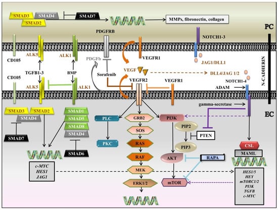 Diagram of the interlinking latticework among VEGF, NOTCH, PDGF, TGFB, and downstream signaling pathways. ADAM: Adisintegrin and metalloprotease; ALK: Activin-like kinase; BMP: Bone morphogenetic protein; CSL: CBF1/suppressor of hairless/LAG1; DLL: Delta-like; EC: endothelial cell; ERK1/2: Extracellular signal-regulated kinases 1/2; GRB2: Growth factor receptor-binding protein 2; JAG: Jagged; MAML: Mastermind-like; MEK: Mitogen-activated protein kinase kinase; MMPs: matrix metalloproteinases; mTKI: multi-Tyrosine Kinase Inhibitor; mTOR: mammalian target of rapamycin; NICD: Notch intracellular domain; PC: pericyte; PDGFB: Platelet-Derived Growth Factor b; PDGFRB: Platelet-Derived Growth Factor Receptor B; PI3K: Phosphatidylinositol 3-kinase; PIP2: phosphatidylinositol (4,5)-bisphosphate; PIP3: phosphatidylinositol (3,4,5)-trisphosphate; PKC: Protein kinase C; PLC: Phospholipase C gamma; RAPA: rapamycin; R- SMAD: receptor-regulated SMAD; SMAD: Small Mothers Against Decapentaplegic protein; SOS: Son of sevenless; TGFB: Transforming growth factor beta; VEGF: Vascular endothelial growth factor; black arrows: main signaling pathways; blunt-ended lines: blockade/inhibition; dashed arrows: induction/activation. Segments of the figure were sketched by using artworks from Servier Medical Art (15 November 2021). Servier Medical Art by Servier is licensed under a Creative Commons Attribution 3.0 Unported License, https://creativecommons.org/licenses/by/3.0/ (access on 15 November 2021).