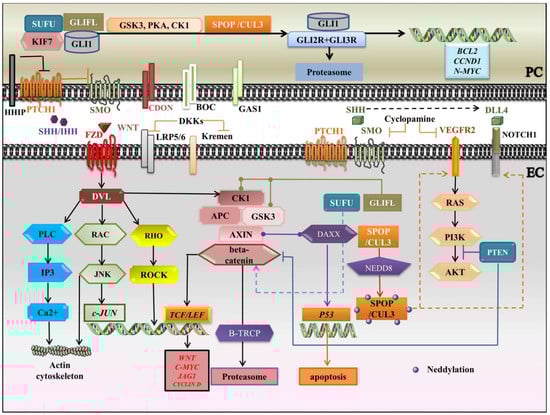 We summarize the crosstalk between HH, WNT, VEGF, and NOTCH signaling pathways in Figure 3. Briefly, in the HH canonical pathway, SHH/IHH-widely involved in angiogenesis- binds to PTCH1 and the inhibition of SMO is relieved, which avoids the cleavage of GLI2 and GLI3 and induces the release of GLI from SUFU and KIF7. The associated coreceptors, CDON, BOC, and GAS1 enhance ligand-receptor association, whereas HHIP inhibits it. In the absence of HH ligands, GLI1, GLI2, and GLI3 are phosphorylated by PKA, GSK3, and CK1, and are supervised by the UBE3 ligase complex, SPOP/CUL3, to induce the repressor forms, targeted for proteasome degradation. After HH ligand/receptor complex formation, the signal is mainly transduced through GLI1, serving as both downstream effector and target gene. Cyclopamine, which is a SMO antagonist, also inhibits VEGF and PTCH1 in EC. SHH upregulates the NOTCH1 receptor in both PC and EC. The neddylation (conjugation with NEDD8- a PTM) of CUL3-based UBE3 increases VEGFR2 (the main effector of HH), NOTCH1, and DLL4 levels. The WNT signaling is a key ingredient in cell proliferation/apoptosis, and vessel remodeling. WNTs associate with Frizzled (FZD), linked to co-receptors LRP5/6. Dishevelled (DVL) mediates the signal throughput to canonical and non-canonical pathways. The non-canonical WNT signaling is divided into WNT/PCP and WNT/Ca2+ pathways and coordinates actin cytoskeletal rearrangements. In WNT/PCP signaling, upon RAC GTPase actuating, JNK settles c-JUN transcription. In turn, RHO GTPase activates ROCK. Besides, the WNT/Ca2+ pathway turns on PLC, which activates IP3 to release Ca2+. DKKs, as WNT antagonists, associate with LRP5/6 and Kremen receptors and dictate the withdrawal of LRPs from the plasma membrane. In the canonical WNT pathway, if a WNT ligand is absent, beta catenin is phosphorylated by a destruction complex (APC, AXIN, CK1, GSK3), which is discerned by UBE3 ligase B-TRCP and targeted for proteasomal degradation, so the target genes are repressed by TCF/LEF. Once the pathway is activated by a ligand, the stabilization of beta-catenin is promoted, and it moves to the nucleus where it activates TCF/LEF and transcribes the target genes. WNT/beta-catenin collaborates with HH signaling in a positive feedback loop. The two pathways are mediated by GSK3, CK1, SUFU, PTEN, and SMO. SUFU negatively regulates GLI signaling and beta-catenin. Additionally, the loss of PTEN could switch on both beta catenin and GLI. Prominently, DAXX associates with AXIN to stimulate the tumor suppressor P53 to prompt apoptosis.