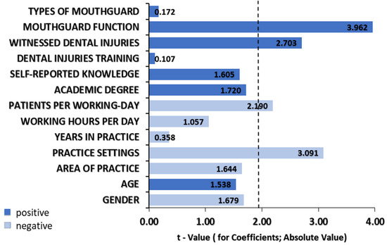 Figure 1 illustrates the association knowledge level in dental injury management with self-reported knowledge, demographic data, and attitude towards dental injuries. Knowledge score was significantly associated with pediatrician’s personal experience with dental injuries (β = 0.574, SE = 0.212, p = 0.008) and knowledge of dental mouthguard function (β = 0.883, SE = 0.223, p ≤ 0.001).