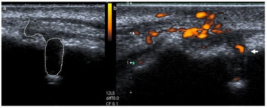 (a) B-mode ultrasound examination showing a sinus tract disrupting the vestibular bone, presenting as a dishomogeneous, hypoechoic pathway lined by echogenic and reinforced contours. (b) Power Doppler applied to the same area, showing an echogenic, solid lesion with poorly defined hyperechoic bone boundaries and internal blood vessels.