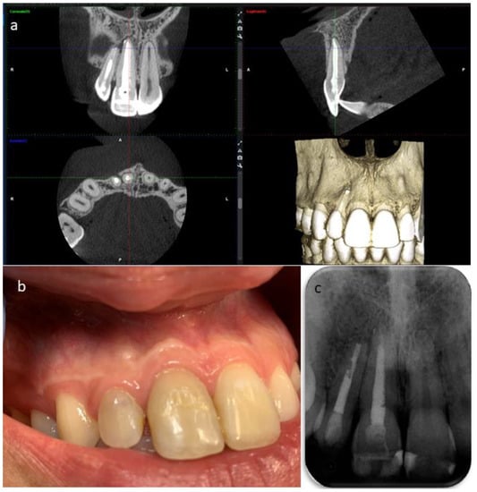 A 25-year-old Caucasian female patient was referred to the Department of Endodontics of the University of Cagliari, with the chief complaint of periodical drainage of purulent material from the opening of a sinus tract located in the buccal mucosa, apical to teeth 1.2 and 1.1, in the fall of year 2017. The sinus tract had appeared a few months earlier. The patient’s medical history was positive for chronic bronchial asthma, and non-contributory for other diseases or medications. The patient reported a sport-related dental trauma due to a body contact with another player, which occurred six years earlier (2011) when she was an agonist volleyball player. As a consequence of that trauma, she reported the enamel-dentinal fracture of teeth 1.1 and 2.1 and the concussion of tooth 1.2, according to the IADT guidelines []. In 2014 (3 years after the trauma) she developed an acute apical abscess on tooth 1.2, and a root canal treatment was then performed. Starting in 2017, the patient manifested a periodical discharge of pus in that same area, that was managed with antibiotic therapy and self-performed drainage for a while. The day of our visit, besides the active pus discharge, the patient referred to tenderness of tooth 1.2 when chewing. Upon clinical examination, the presence of two discolored restorations on teeth 1.1 and 2.1 were noted, as well as the stoma of a sinus tract in the alveolar mucosa apical to teeth 1.1 and 1.2 (Figure 1). The clinical exams performed on tooth 1.2 showed tenderness to palpation, percussion, and the bite test, and no periodontal probing, while tooth 1.1 showed an uncertain response to the thermal testing (cold test) and no other signs or symptoms. A periapical radiograph, taken with the paralleling technique, depicted the presence of a root canal treatment, looking not adequate, as well as a periapical radiolucency on tooth 1.2 (Figure 2), and no apparent lesions or widened periodontal ligament on tooth 1.1. A subsequent radiograph with a gutta-percha cone introduced in the opening of the tract traced the route of the drainage, showing the periapical lesion on tooth 1.2. as the source for this condition (Figure 2).