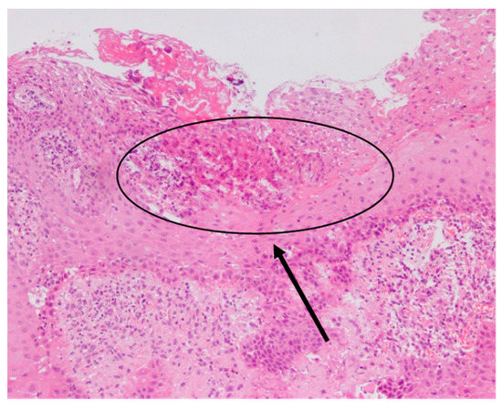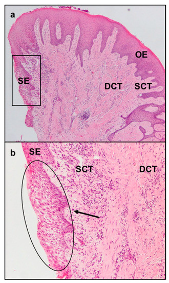 Microscopically, the following have been evaluated: (i) the integrity of epithelium or the presence of erosion/ulceration; (ii) the presence and characteristic of inflammatory infiltration (i.e., acute with neutrophils or chronic with lymphocytes and plasma cells); (iii) the orientation of collagen fibers and characteristic of capillary vessels have been considered.