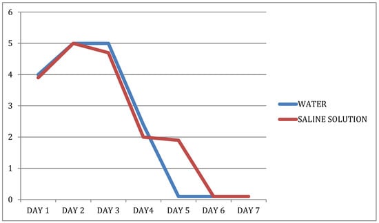| DAY | Water | Saline Solution | p Value Group | p Value Time | p Value Group × Time |