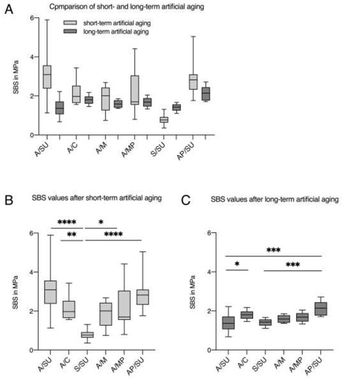 The investigation of SBS values after short- and long-term aging showed a distinctive pattern. All SBS values decreased after longer aging. Only the initially lower SBS values of S/SU adjusted to the other groups after prolonged aging and increased slightly (Figure 1A and Table 1).