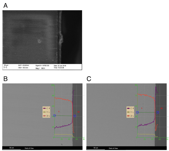 The EDS analysis for the AP/SU group showed a carbon content of 18% at the 50 µm depth. However, this increased to a value of 27% at the surface. The percentage of zirconium decreased in a similar pattern (Figure 2C).