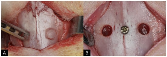 With the aid of a 3.0 mm diameter trephine and a spherical diamond drill (Neodent, Curitiba, Paraná, Brazil), under constant irrigation with sterile saline solution, antrostomies were performed on both sides of the nasal dorsum (Figure 1A,B), according to the protocol already carried out and published previously [].