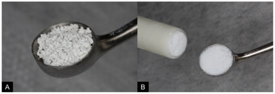 Similar volumes of synthetic alloplastic bone substitute in granules ((A); Maxresorb®) or paste ((B); Maxresorb® inject) were used.