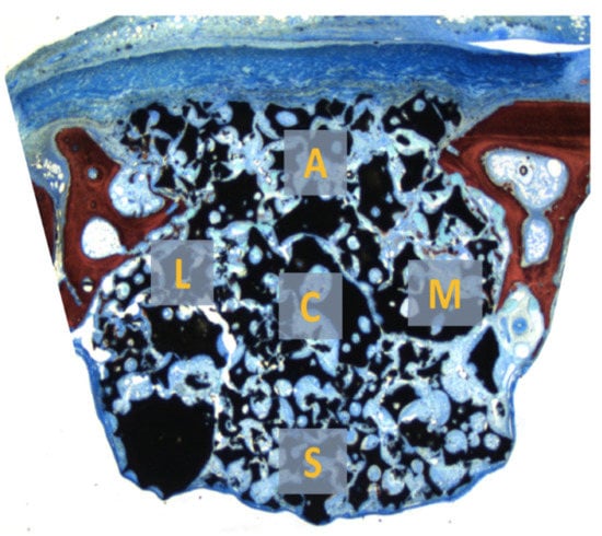 Five distinct areas from the grafted site were determined and used for analysis as follows: (A) the antrostomy region; the areas close to the (M) medial bone wall and (L) lateral bone wall; (C) the central area of the graft; (S) sub-Schneiderian region, subjacent the sinus mucosa (Figure 4).