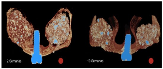 The total volume of the graft showed a reduction of 29.5%, for the granule group, and 33.9%, for the paste group, after 10 weeks. This result may be associated with the presence of a greater amount of graft remaining in the granule group, mainly because the water-based gel has been reabsorbed.