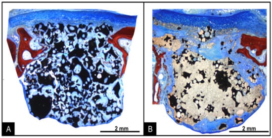 In an experiment in rabbits [], defects were created in the maxilla and filled with prehydrated and collagenated porcine bone particles with or without the addition of collagen gel. Different periods of healing were evaluated, and no differences were observed in new bone formation between the two different formulations of biomaterial. In a multicenter randomized control trial [], 37 patients underwent maxillary sinus floor augmentation with deproteinized bovine bone mineral or prehydrated and collagenated porcine bone particles with the addition of collagen gel. Biopsies were collected for histological examination after 6 months of healing. Similar proportions of bone were found in both groups (~37%).